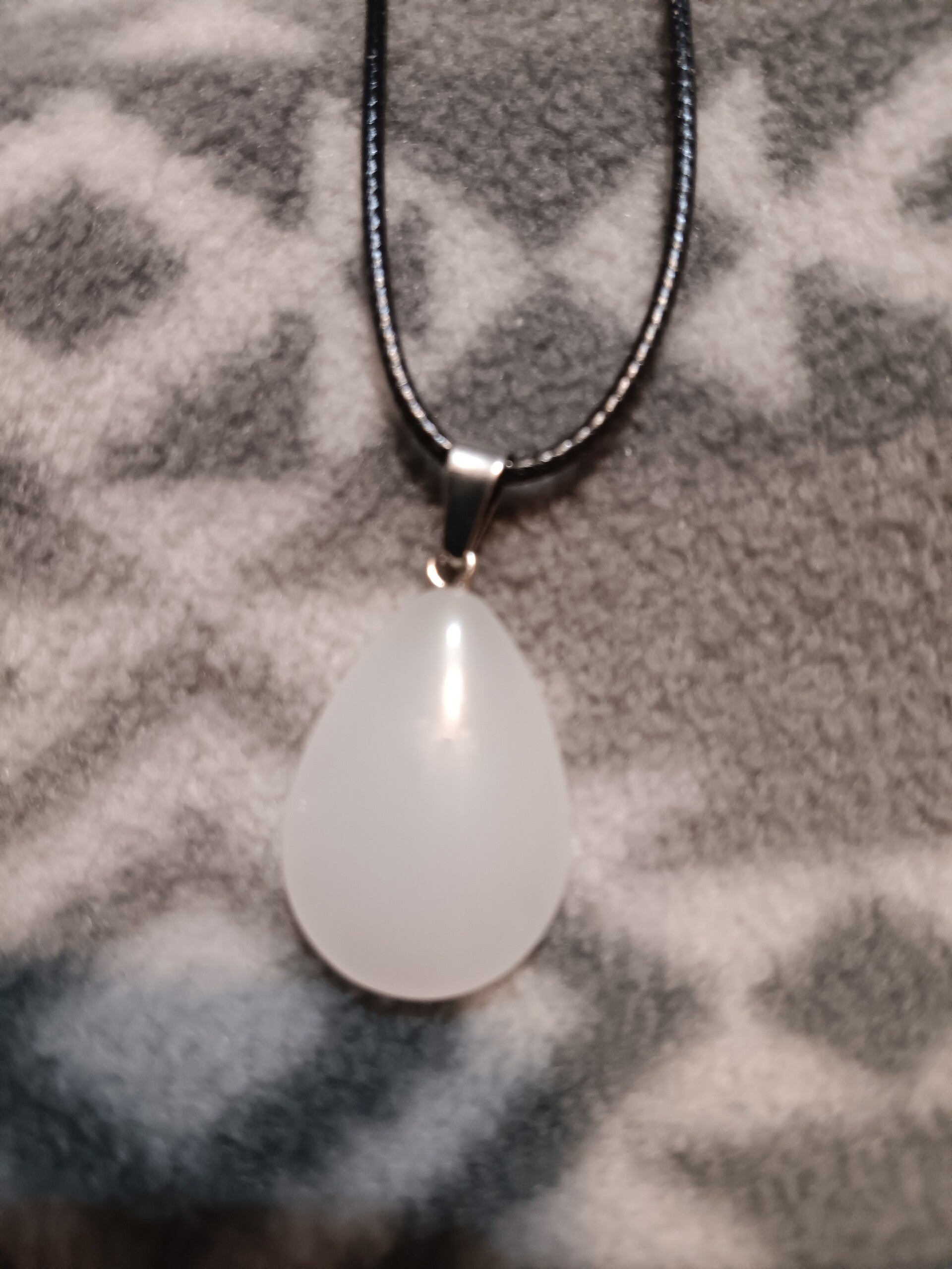 opalite teardrop pendant necklace on a black cord.