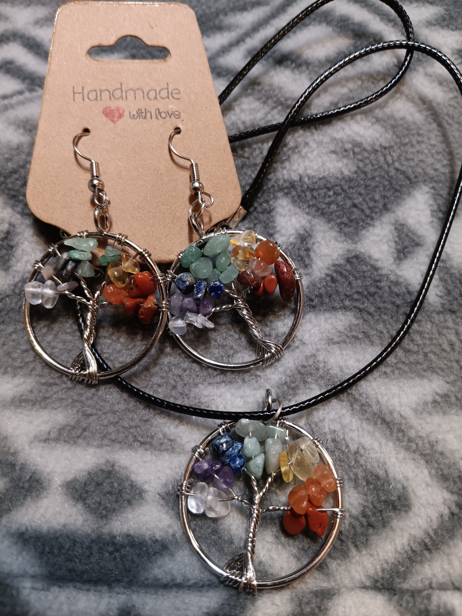 This is a metal wire-wrapped "Tree of Life" pendant featuring colorful gemstone chips, often associated with the seven chakras.